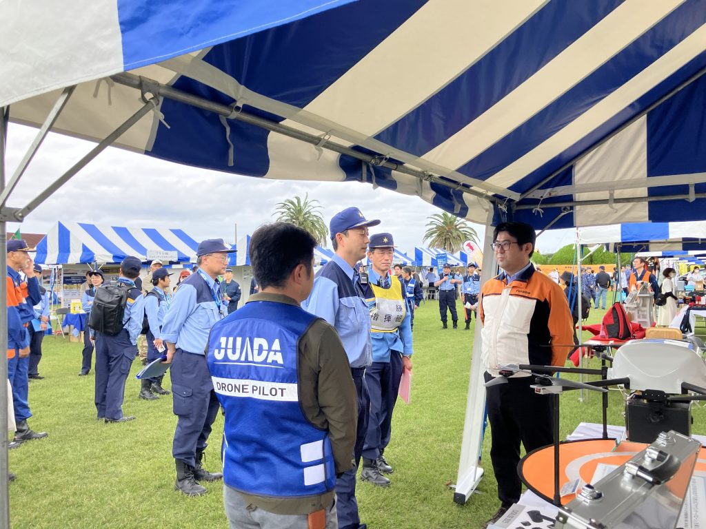 訓練後当社ブースには千葉県知事・熊⾕俊人様にもご来訪いただき、当社ドローンの機能や性能、災害時をはじめとした様々な活用シーンについてご紹介しました。当社からは地元企業として今後も千葉県の防災活動に積極的に協⼒していく意向をお伝えし、知事からも当社の取り組みに対する期待のお⾔葉を頂戴しました。