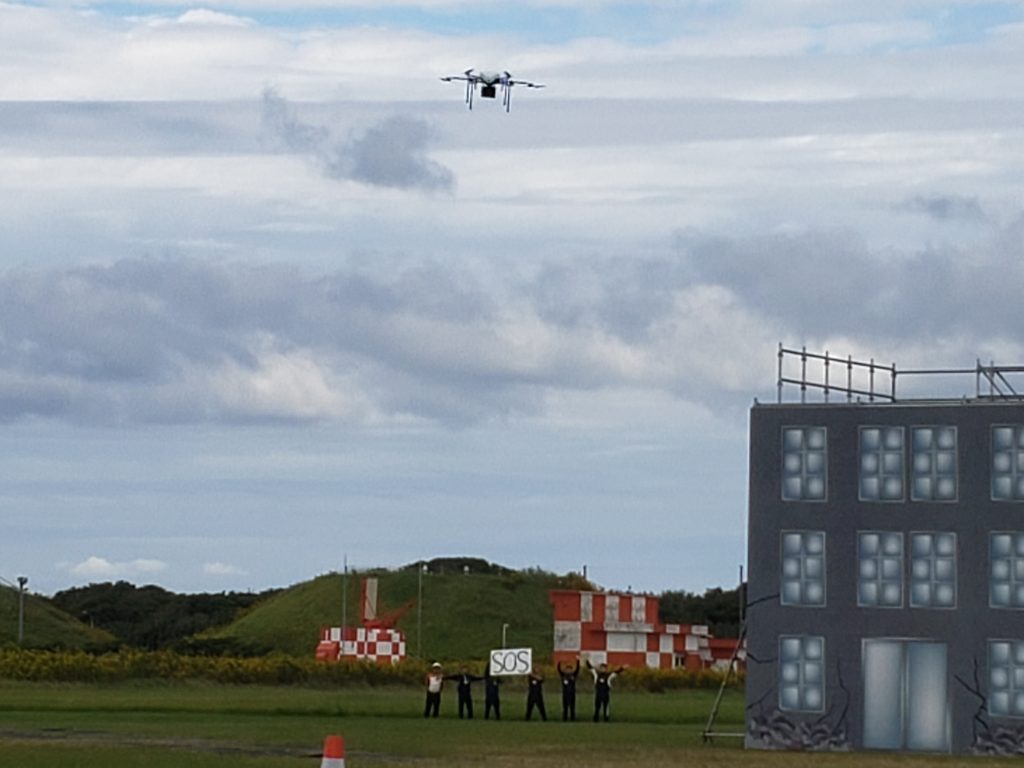 救出救助実動訓練では、南海トラフ地震発生直後の、医薬品を想定した物資輸送デモをFMC-02H機にて実施し、1kg相当のボックスを訓練エリアの反対側まで約10分かけて輸送しました。受け取りは千葉県消防学校の学生の皆様が担当され、デモは円滑に進行いたしました。デモフライト中は天候が目まぐるしく変化し、雨も降りましたが、当社ドローンは防水性を強みの1 つとしており、悪天候下でも安定した飛行性能を示し、問題なくフライトを完遂しました。